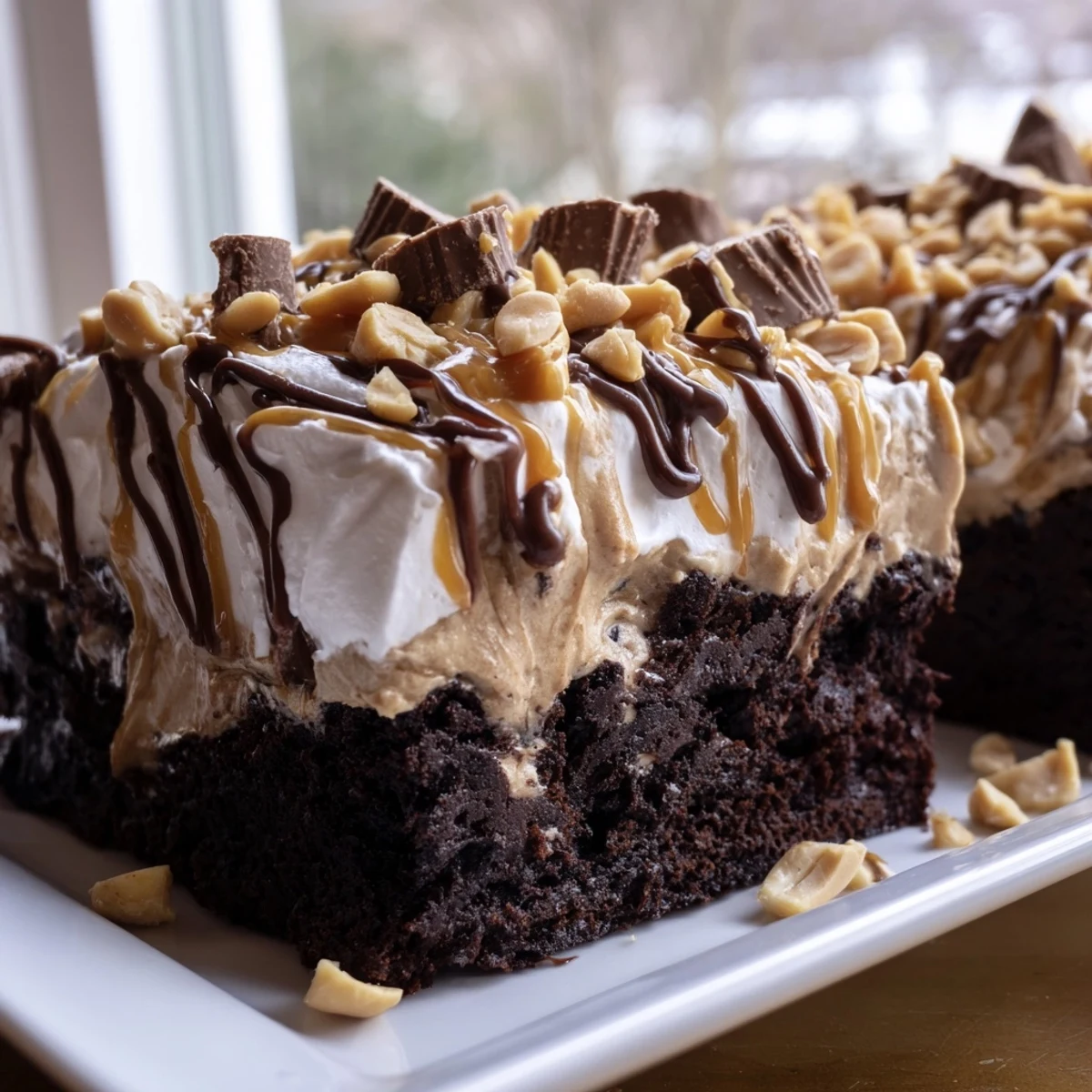 - Sprinkle chopped peanuts and halved mini peanut butter cups over the top while the drizzle is still slightly tacky so they adhere. Chill the completed cake for thirty minutes before serving to let all the layers settle into perfect harmony.