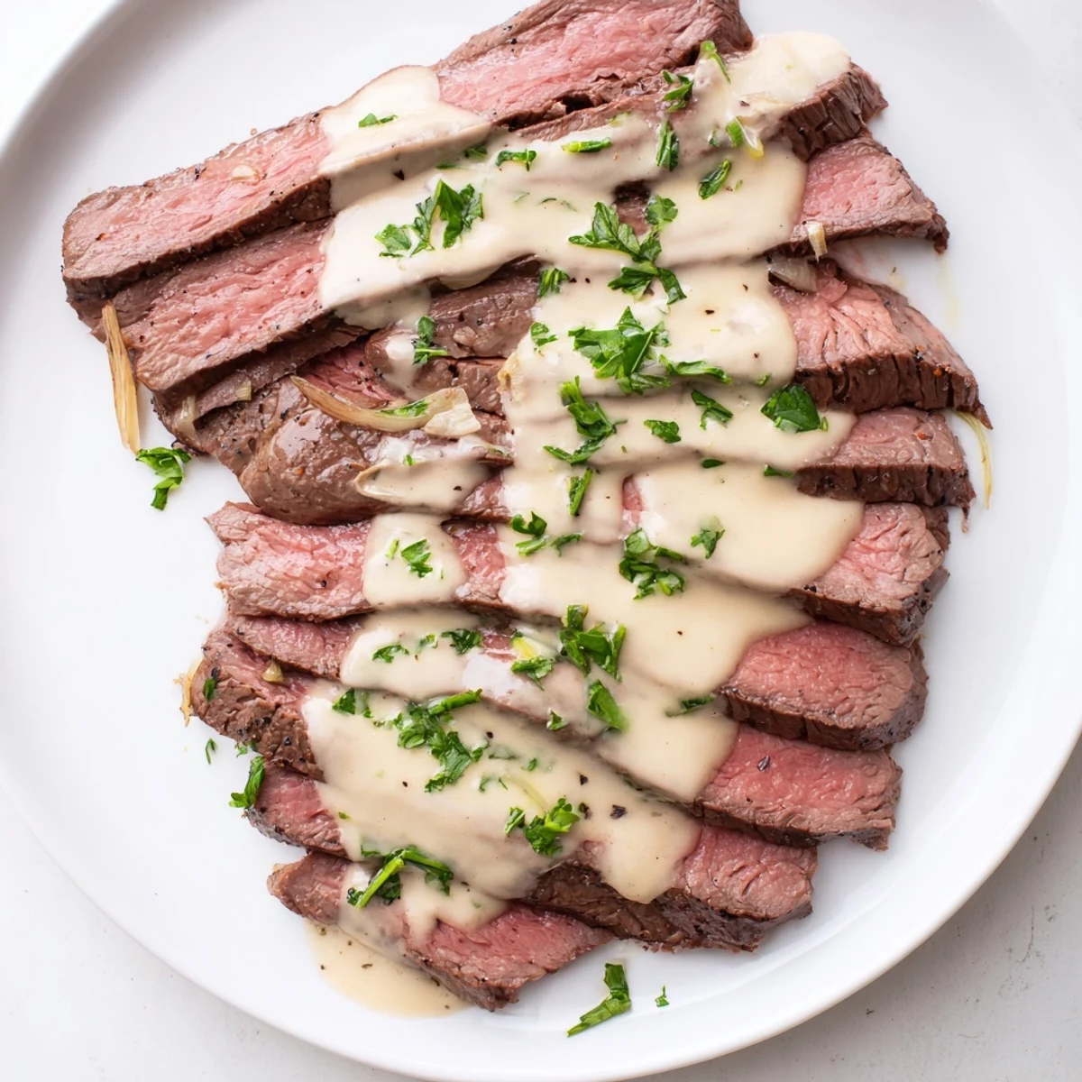 - Cut the steak thinly against the grain at a slight angle, arrange it on plates, and spoon that gorgeous roasted garlic sauce all over everything. Sprinkle with fresh parsley if you want it to look as good as it tastes.