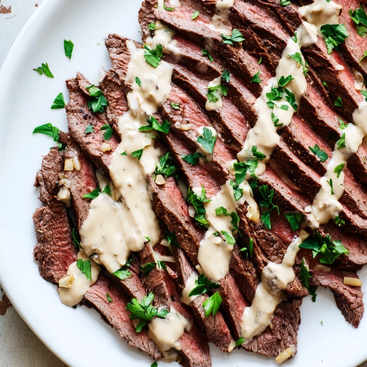 This impressive dish features perfectly seared flank steak paired with an irresistibly creamy roasted garlic sauce. The garlic bulbs roast until golden and sweet, then blend into a velvety sauce with broth, cream, butter, and Dijon mustard. The steak develops a beautiful crust from stovetop searing before finishing in the oven.