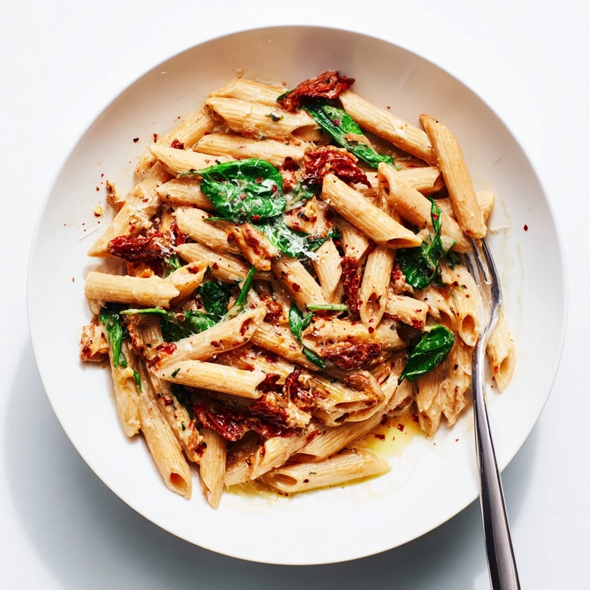 This indulgent one-pan pasta brings together sun-dried tomatoes, fresh spinach, and a luxurious cream sauce that coats every strand. The entire dish comes together in a single skillet—pasta cooks directly in vegetable broth, absorbing all those savory flavors as it simmers.