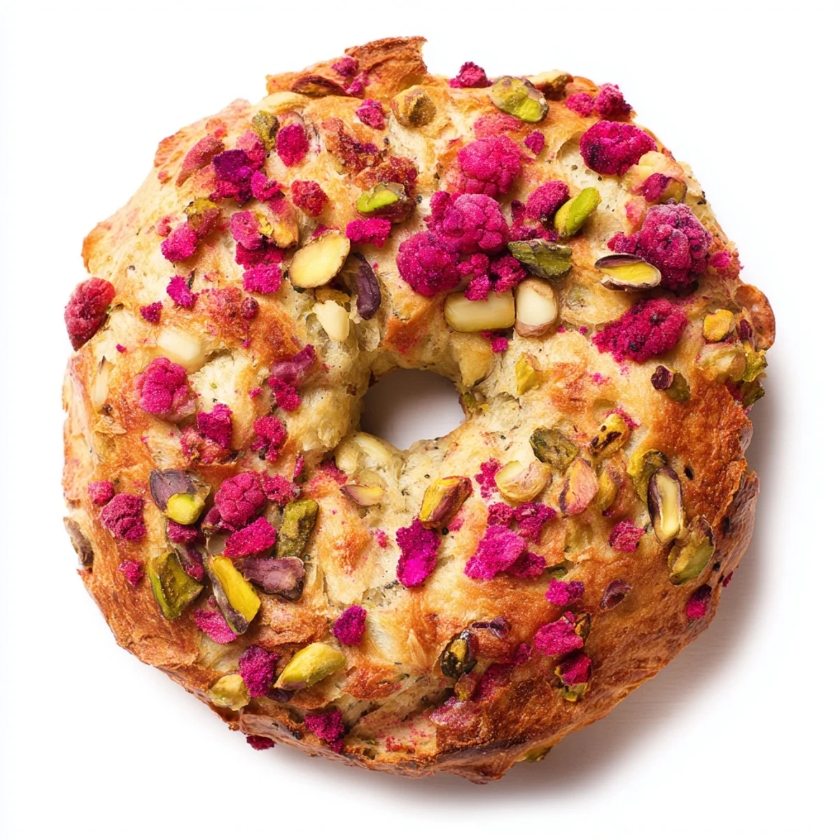 These vibrant bagels combine the complex tang of long-fermented sourdough with the sweet-tart pop of freeze-dried raspberries and buttery crunch of pistachios. The dough develops deep flavor through an overnight ferment, creating that perfect chewy interior and glossy crust. Each bagel gets briefly poached in honey-sweetened water before baking, ensuring the classic dense texture and shiny finish. The result is a breakfast masterpiece that's both visually stunning and deliciously satisfying.