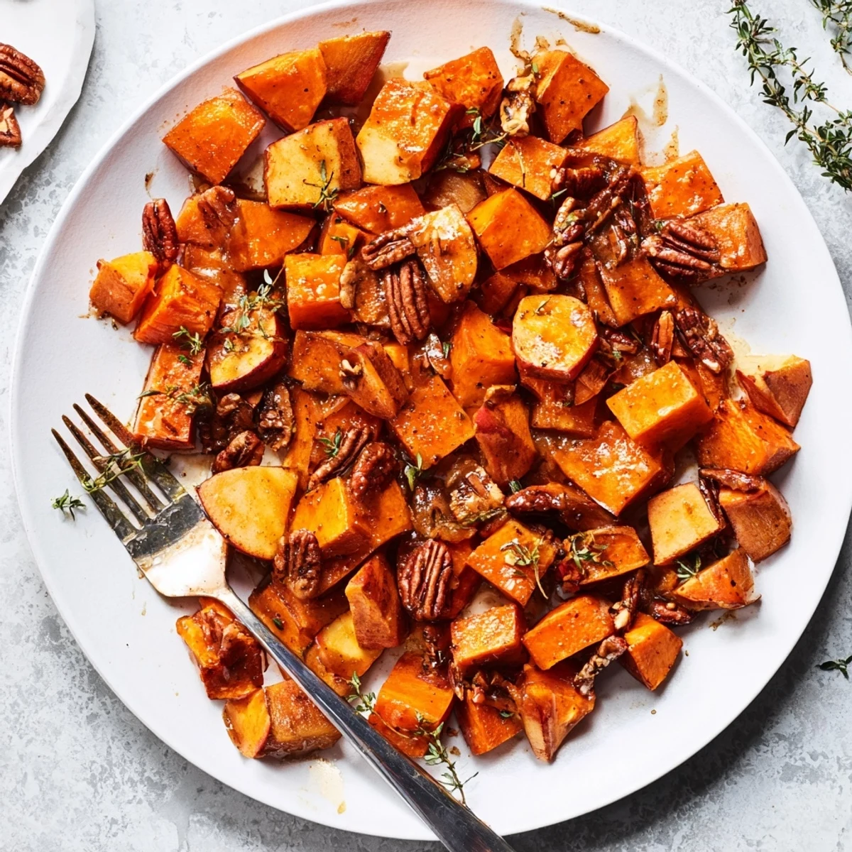 Tender roasted sweet potatoes and crisp apples come together in a warm cinnamon-maple glaze that captures the essence of autumn. This simple yet elegant side dish features naturally sweet vegetables and fruit caramelized in the oven until edges are golden and flavors are concentrated. The combination of pure maple syrup, butter, warming cinnamon and nutmeg creates a luscious coating that enhances the natural sweetness of the produce. Ready in under an hour, this versatile dish pairs beautifully with roasted turkey, pork tenderloin, or vegetarian main courses. Optional pecans or walnuts add satisfying crunch, while fresh thyme provides an herbal finish that balances the sweetness.
